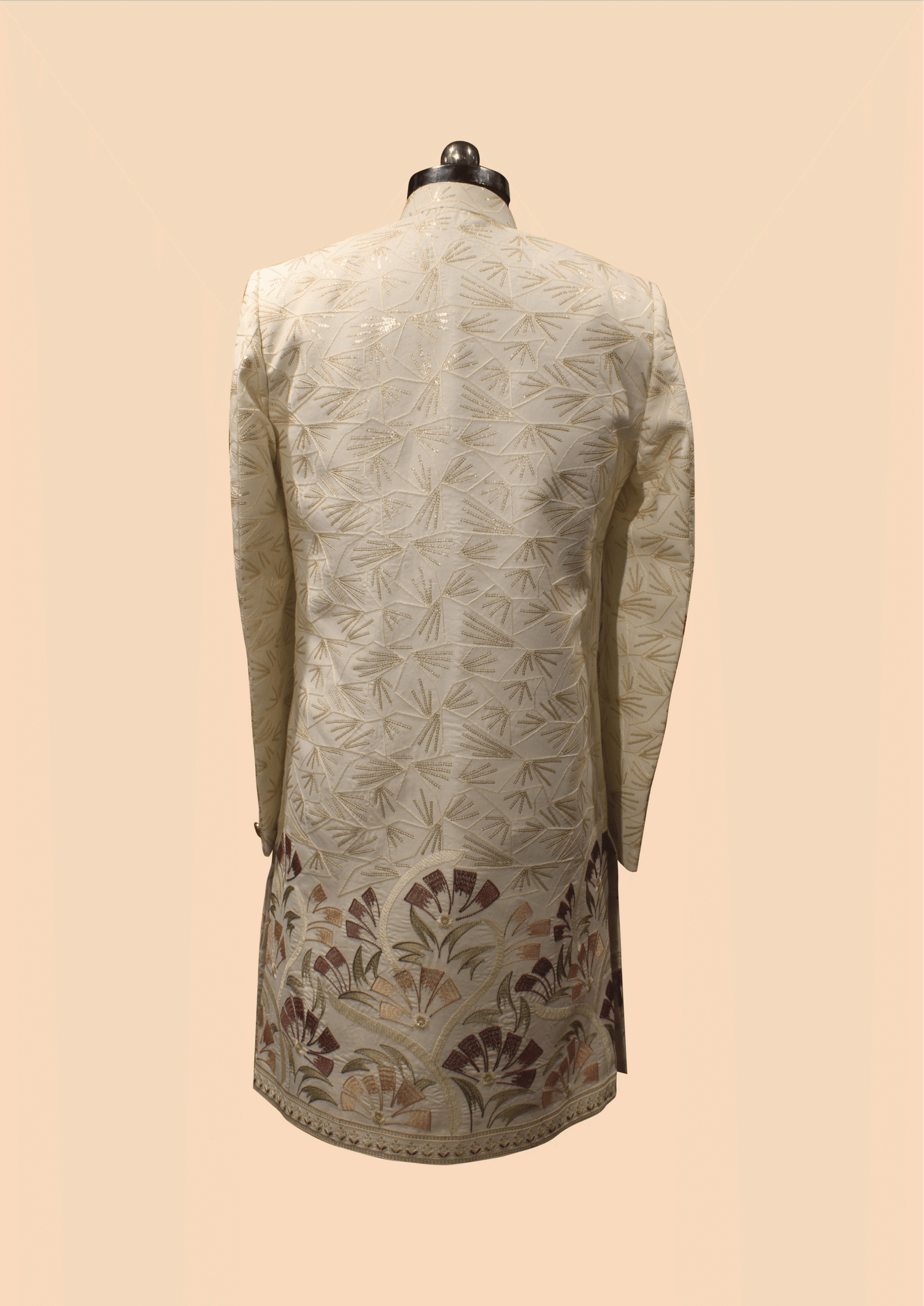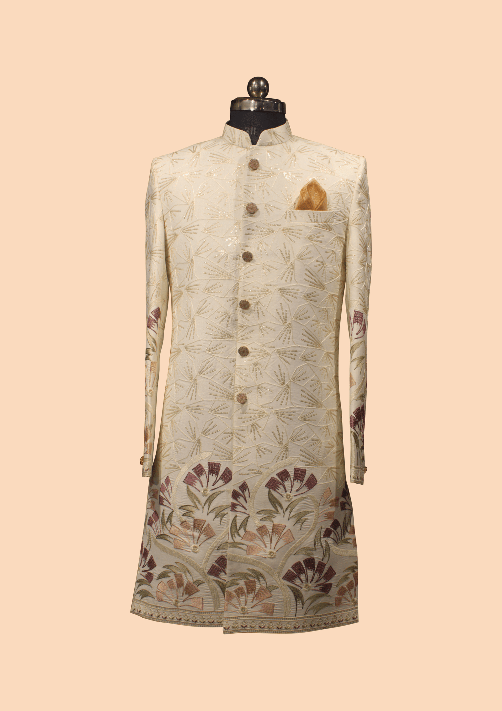 Elegant Cream Floral Embroidered Sherwani with Golden Detailing