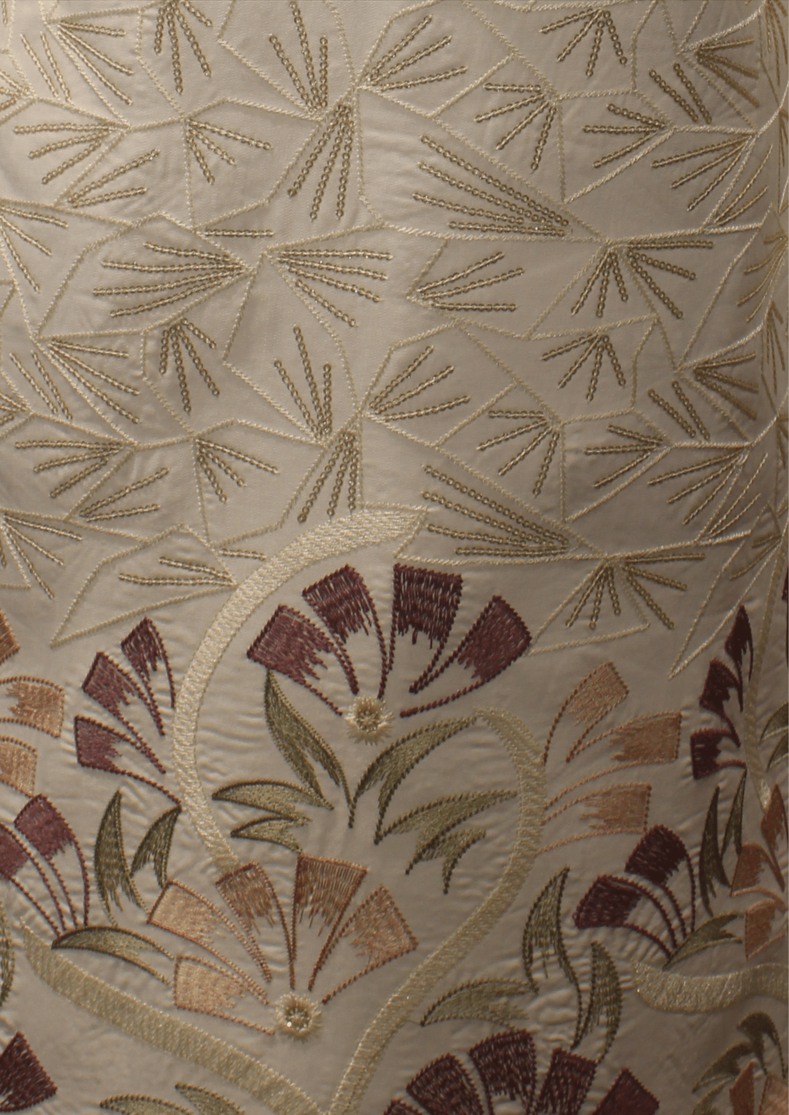 Embroidery: Intricate floral embroidery in gold thread, highlighted with subtle sequins