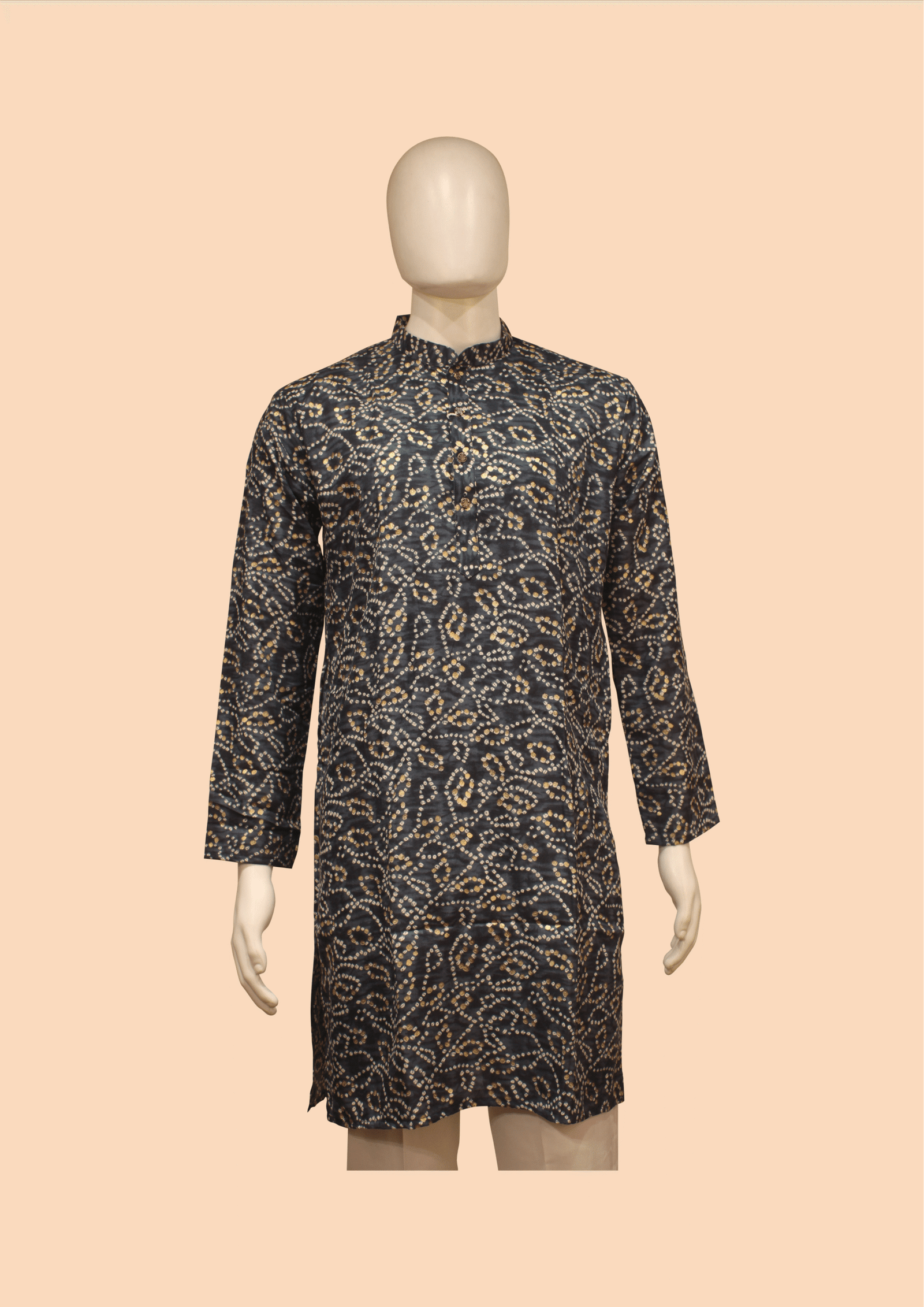 Step into timeless elegance with the Elegant Midnight Kurta, a perfect blend of tradition and modern style. Crafted from soft, breathable fabric, this kurta features a rich black base adorned with intricate dotted patterns in subtle beige and gold hues, creating a visually striking yet understated design.