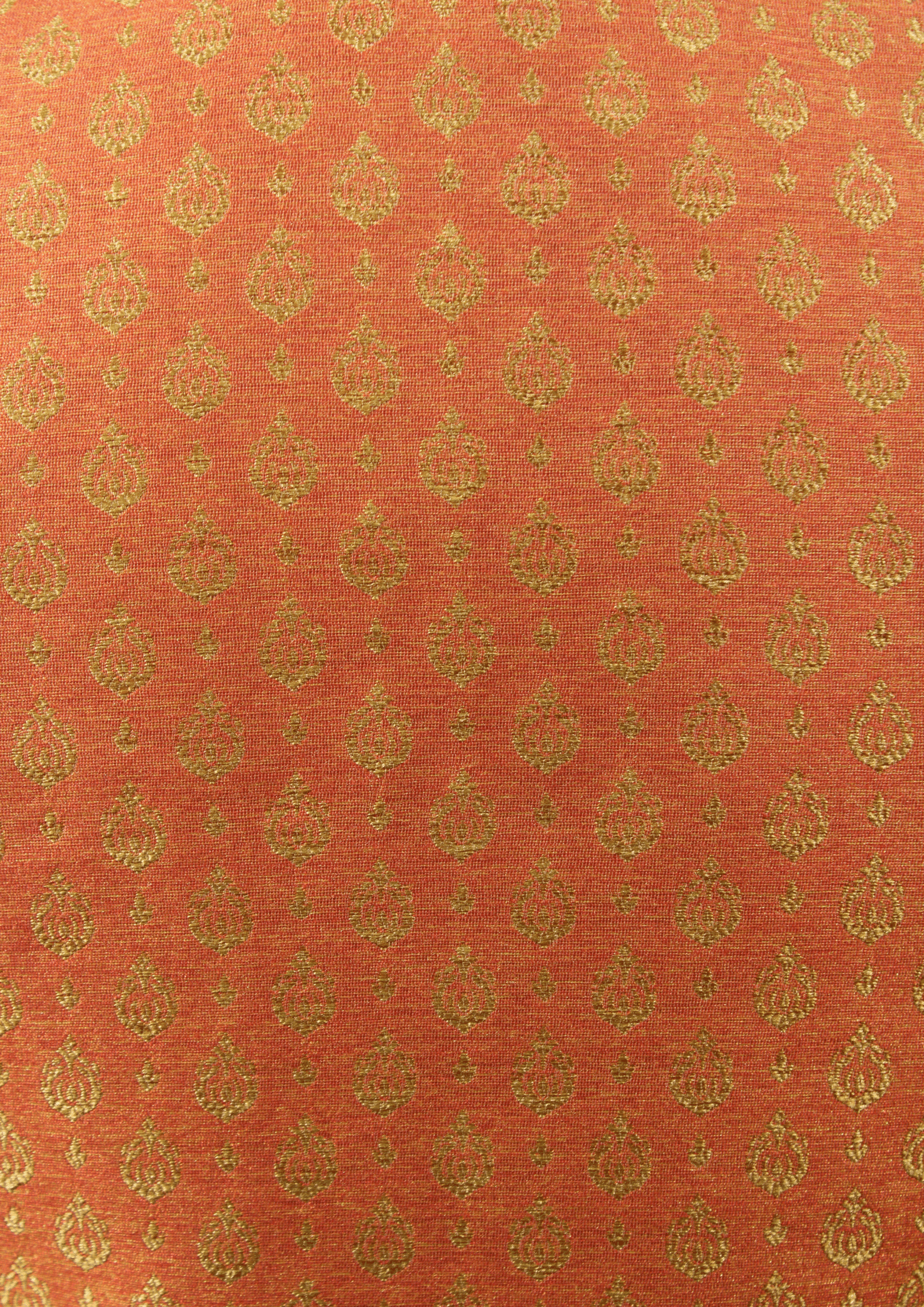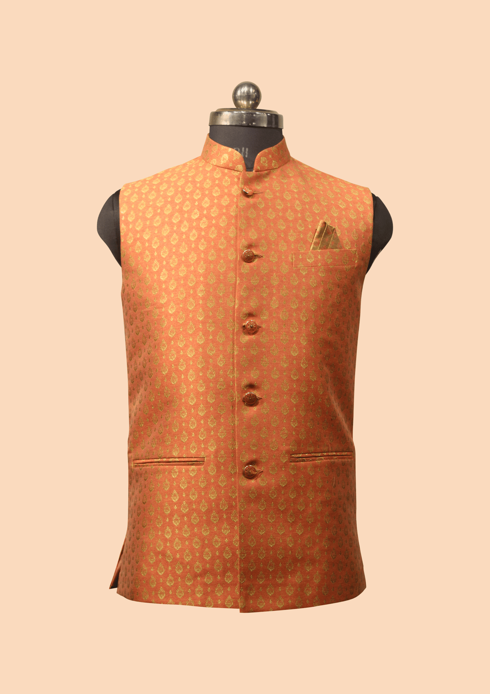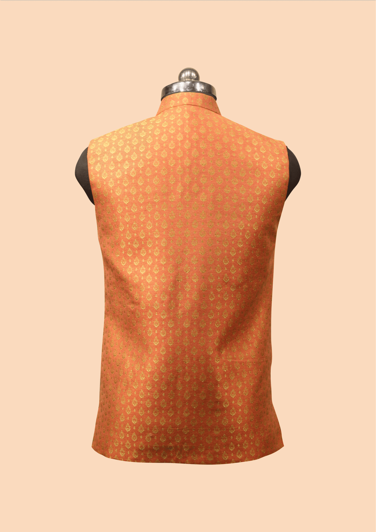 Add a vibrant dash of tradition to your festive wardrobe with this striking orange-gold Nehru jacket. Crafted from premium brocade fabric with intricate golden motifs, this sleeveless jacket is perfect for elevating your kurta-pajama or shirt ensemble for weddings, sangeet nights, festivals, or special occasions.
