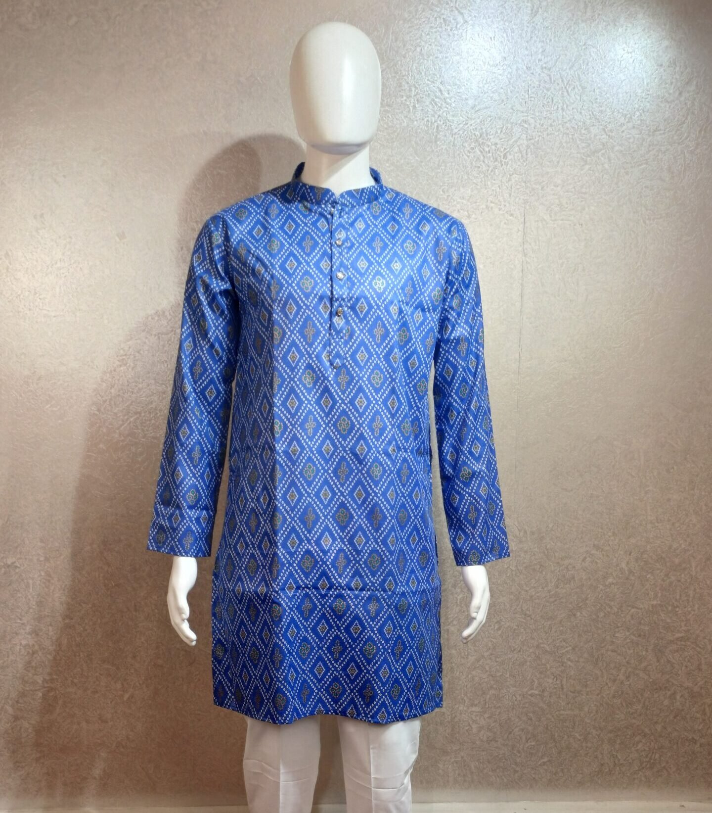 The vibrant royal blue base is beautifully accented with geometric diamond motifs in golden and white, inspired by traditional hand-block patterns. Its tailored silhouette and soft finish ensure comfort and sophistication in equal measure.