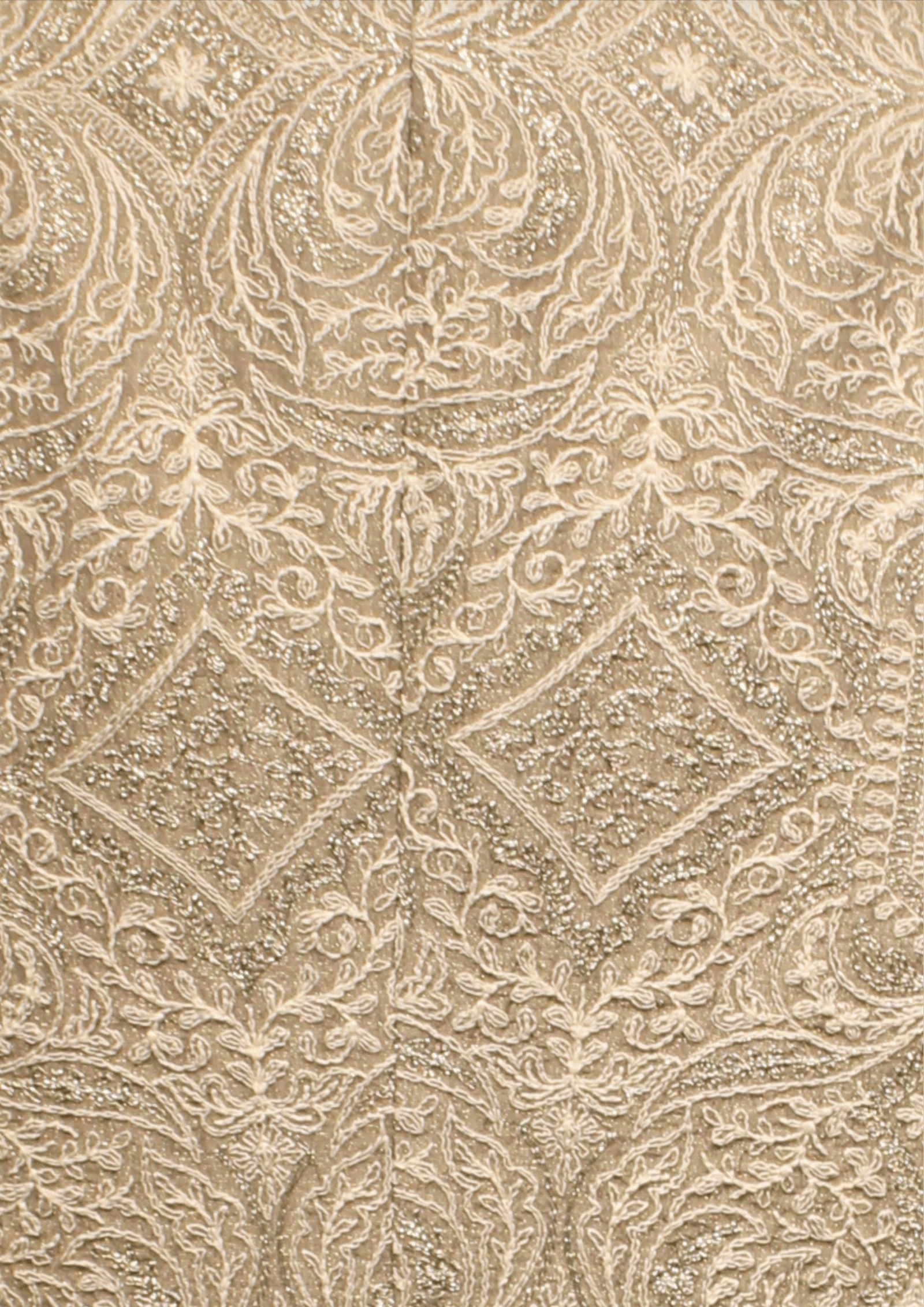 Intricate thread and zari embroidery with floral and paisley motifs
